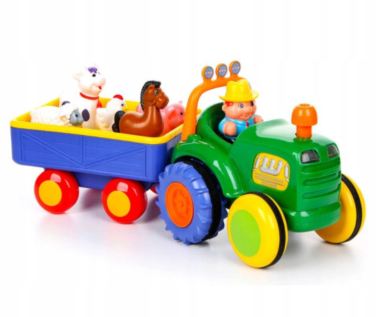 Traktor Farmer Dumel to kolorowa i interaktywna zabawka, która będzie wymarzonym prezentem dla wszystkich przyszłych farmerów! Traktor z przyczepką zawiera 5 zwierzątek, które nagradzają dzieci dźwiękami za odgadnięcie kształtu i umieszczenie figurki w odpowiednim miejscu. Zabawie towarzyszą wesołe melodie oraz rymowanki, które przybliżą najmłodszym sekrety życia na farmie.
