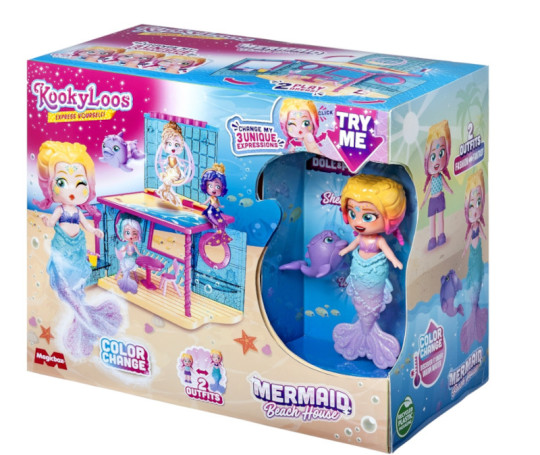 Odkryj fascynujący świat KookyLoos Mermaids, gdzie syrenki spotykają się, relaksują i cieszą czasem na plaży. Beach House to idealne miejsce na odpoczynek po wodnych przygodach. Domek można przekształcić w Bar Smoothie, aby KookyLoos mogły cieszyć się pysznymi koktajlami. W zestawie znajdziesz figurkę, która zmienia się w syrenkę, oraz jej urocze zwierzątko. Co więcej, syreni ogon i delfin zmieniają kolor w ciepłej wodzie, co dodaje zabawie jeszcze więcej magii!